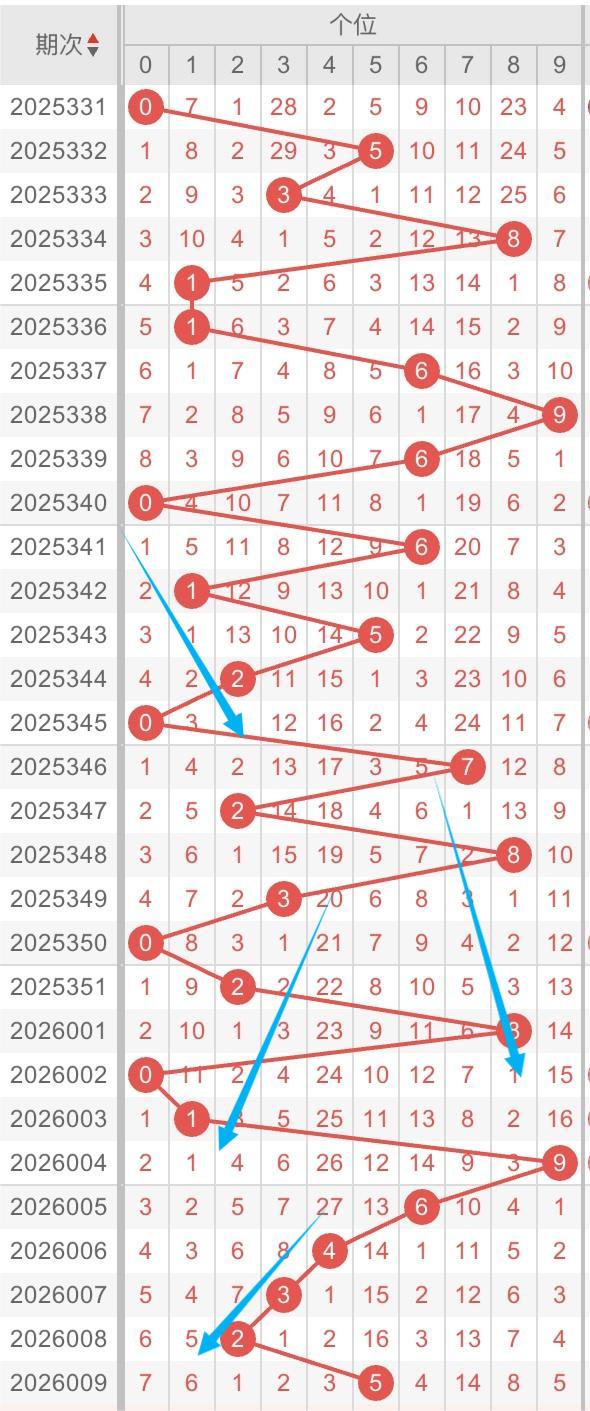 以近30期个位的走势形态分析:大跨度斜连出现。例如:数字1-2-3//4-3-2/7-8-9大跨度隔期斜连。本期重点关注:数字4-5-6形成隔期斜连。个人分析,仅供参考。