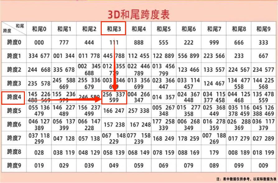 最后分享一个实用的3D和尾值与跨度值组合统计表。组合号码时,根据推测的和尾值结合跨度值,查找统计表上推荐的组合号码。以26009期为例:和值尾3、跨度值4,在统计表上查找的组合号码有:256/337/599,其中组合号码中出256(开奖号码265)。特别注意:统计表上推荐的组合号码,不是直选号码,不定位百十个位的顺序。仅供参考。