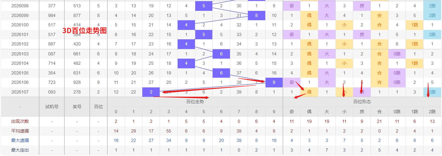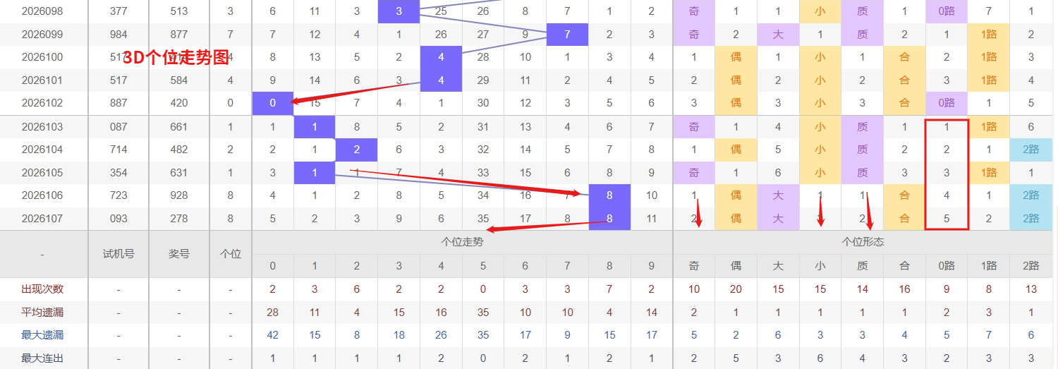 福彩3D个位分析:第2026107期个位开出号码8属于大偶数后端,从以上个位走势图中可以看出近100期的大小比约为55:45奇偶比约为53:47大小奇偶数据上有点差异有需求但不是太明显,不太好看这时就要借助连线走势和遗漏数据来帮助我们缩水号码。上期个位落号“8”大偶数2路号码球,号码开出了0振幅,连续多期的大振必被小振幅取代幅符合我们的预期,那么本期我们在个位考虑振幅走势走前依然要转变思路考虑大振幅,具体考虑(2-6)个振幅是我们主要的方向,那么在对个位落号情况进行系统的分析时我们可以明显的看到个位号码走势呈现大范围震荡,尤其是在号码的落位特点上表现的尤为突出,那么本期我们在个位分析时就要注意号码的风险,避免出现踏空。3D个位走势中,数字2近期表现活跃,属于当前的热号区域,有继续走强的惯性,值得持续关注;而数字5则处于明显的冷号状态,目前已遗漏35期未出,从概率平衡和偏态修复的角度来看,长期深冷之后着反弹需求,重点防范5的回补可能。福彩3D第2026108期个位看好02567。本文由一起彩钱是生命动力所著,请勿转载