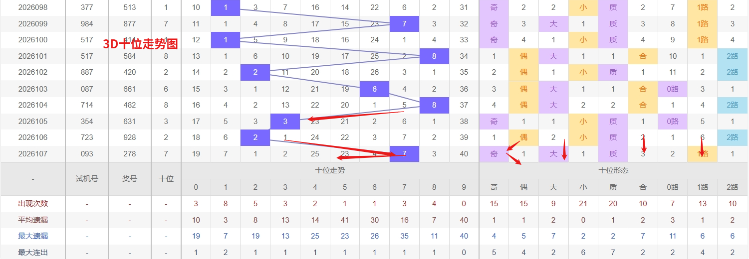 福彩3D十位分析:第2026107期十位开出号码7属大奇数号码后端。以历史100期数据为例十位奇偶比约为48比52,大小比约为46比54近期大小相差5点,根据求均衡的规律开出大数的概率比小数高一点。上期我们分析偶数经过连续回补后有走奇数的可能,开出奖号7大奇数符合我们的预期,3D十位走势中,数字9已遗漏40期未出,属于典型的深度冷号,远超其理论回补周期,从概率平衡和偏态修复的角度来看,长期深冷后往往会出现反弹需求,需重点防范9的回补可能;与此同时,数字1则表现活跃,是当前十位的明显热号,近期出现频率较高且走势稳定,仍有继续走强的惯性,值得持续关注。所以福彩3D第2026108期十位推荐14589。本文由一起彩钱是生命动力所著,请勿转载