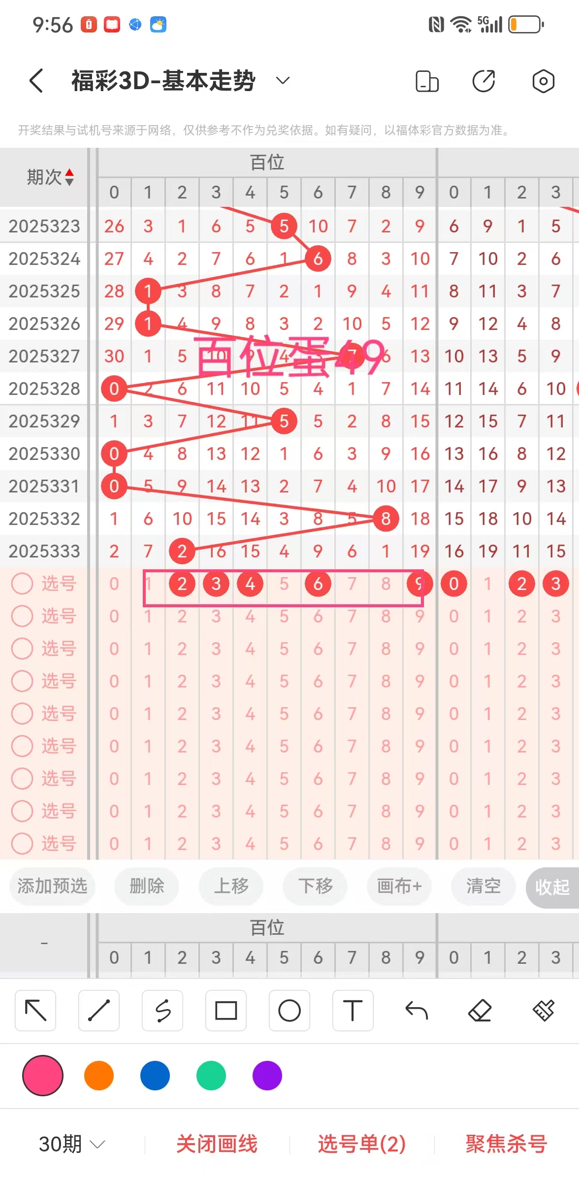 ②个位大小比:近5期大小比为1:4,大号依次开,5,大号中奇偶比为1:0,小号依次开出4203,小号中奇偶比1:3,通过对比分析得出(678123)有可能开其一