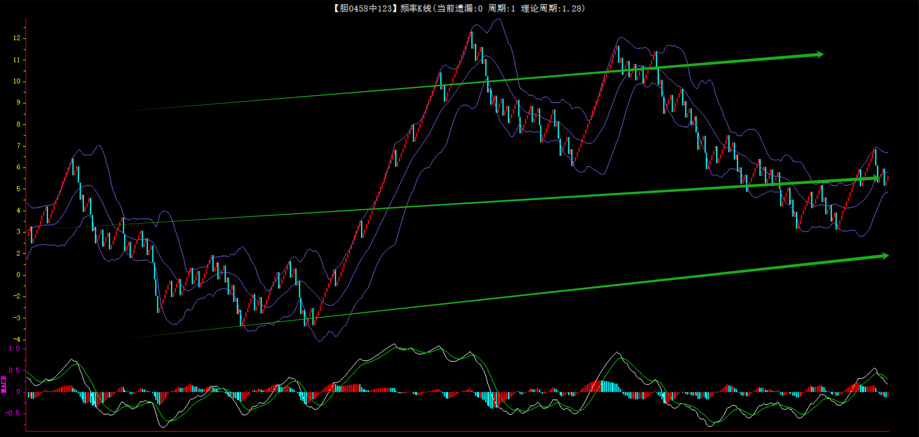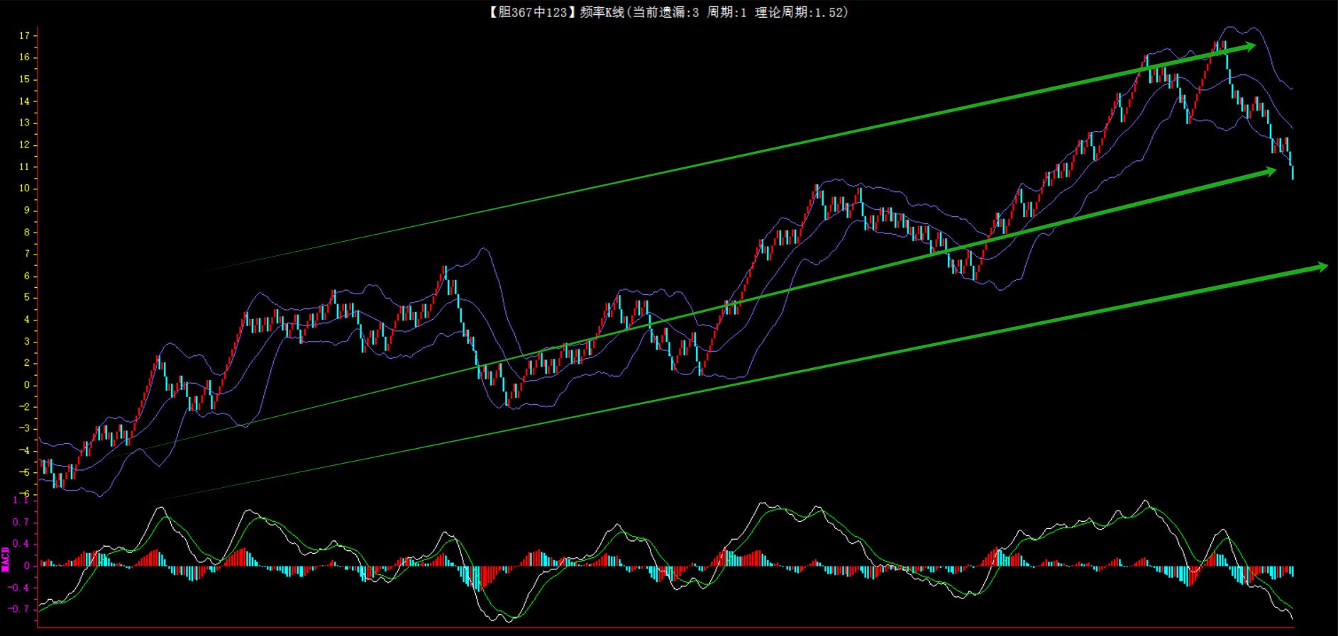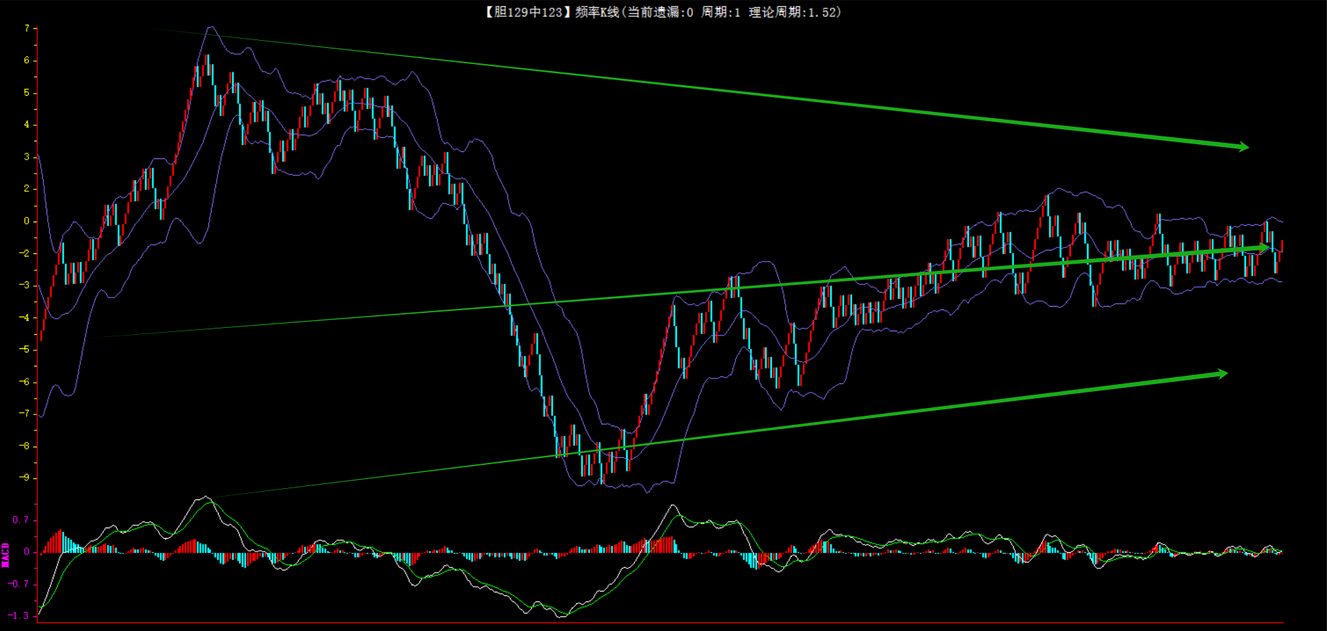 整体趋势上行,上边沿线趋势向上,下边沿趋势也是向上,节点震荡,当前遗漏3期,本期关注。