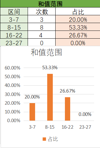 上期和值是9,处在8~15之间,各个类型占比没有变化。目前是8~15占比最优,次之是16~22,最后是3~7。本期看好和值在8~15之间,其次是16~22。