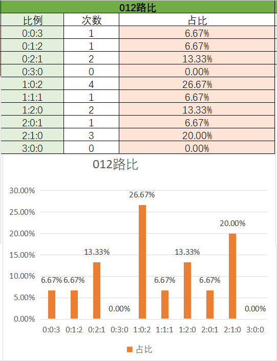 上期012路比是1:1:1,其中1:1:1占比变大,1:2:0占比变小。近15期内,1:0:2是开出最多的,次之是2:1:0,然后是0:2:1,1:2:0,最后是1:1:1,0:1:2,2:0:1,0:0:3。总的看2路最热门,其次是1路,最后是0路,本期看好1:1:1和0:2:1。