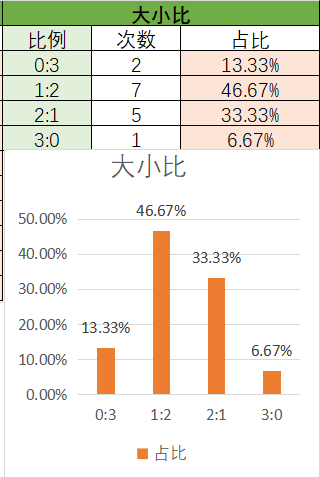 上期大小比为1:2,各个类型占比没有变化。可以看到近15期内1:2优势最好的,其次是2:1,然后是0:3,最后是3:0。本期看好2:1开出,其次是1:2。