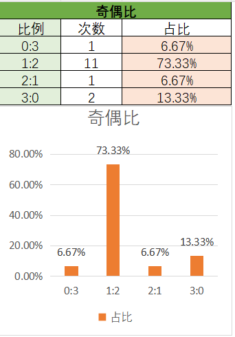上期奇偶比为3:0,其中3:0占比变大,2:1占比变小。近15期内1:2优势最大,其次是3:0,最后是0:3和2:1。上期开了3:0奇偶比,本期看好2:1奇偶比的开出,其次是1:2。