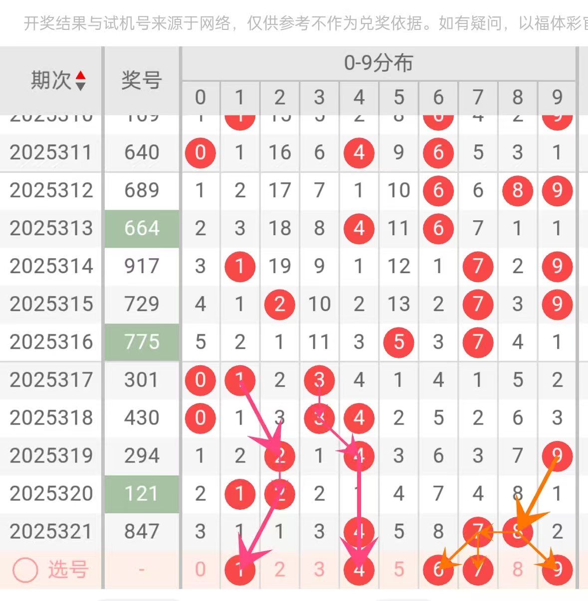 近30期中数字“7”出现频率极高,共出现16次,尤其在最近10期内多次以连号或重号形式出现(如2025321期的8,4,7、2025316期的7,7,5)。该数字在百位、十位、个位均有分布,呈现“跨位活跃”特征,属于典型的热码喷发形态。从走势图上看,“7”在近期形成“间隔回补”节奏,常跟随冷号“0”或“5”后开出,具备较强的顺势延续性。喷子胆取其“喷发”之意,推荐“7”正是基于其高频输出且未显疲态的态势,适合作为主打胆码。
