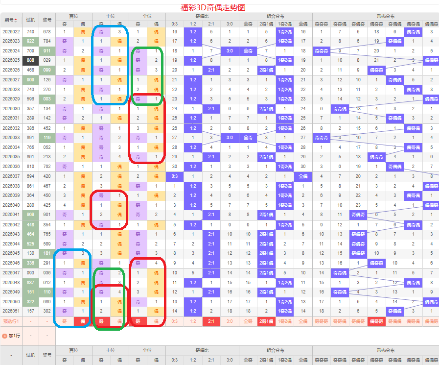上期奇偶比是1:2,两偶的号码组合方式,从近五期的奇偶数出现情况看,奇数出现7次,偶数出现8次,奇数偶数号码出现较平均,本期侧重两奇的号码组合,侧重偶奇奇或偶奇偶的号码组合方式,根据奇偶形态做五码定位02468/13579/13579或02468/13579/02468