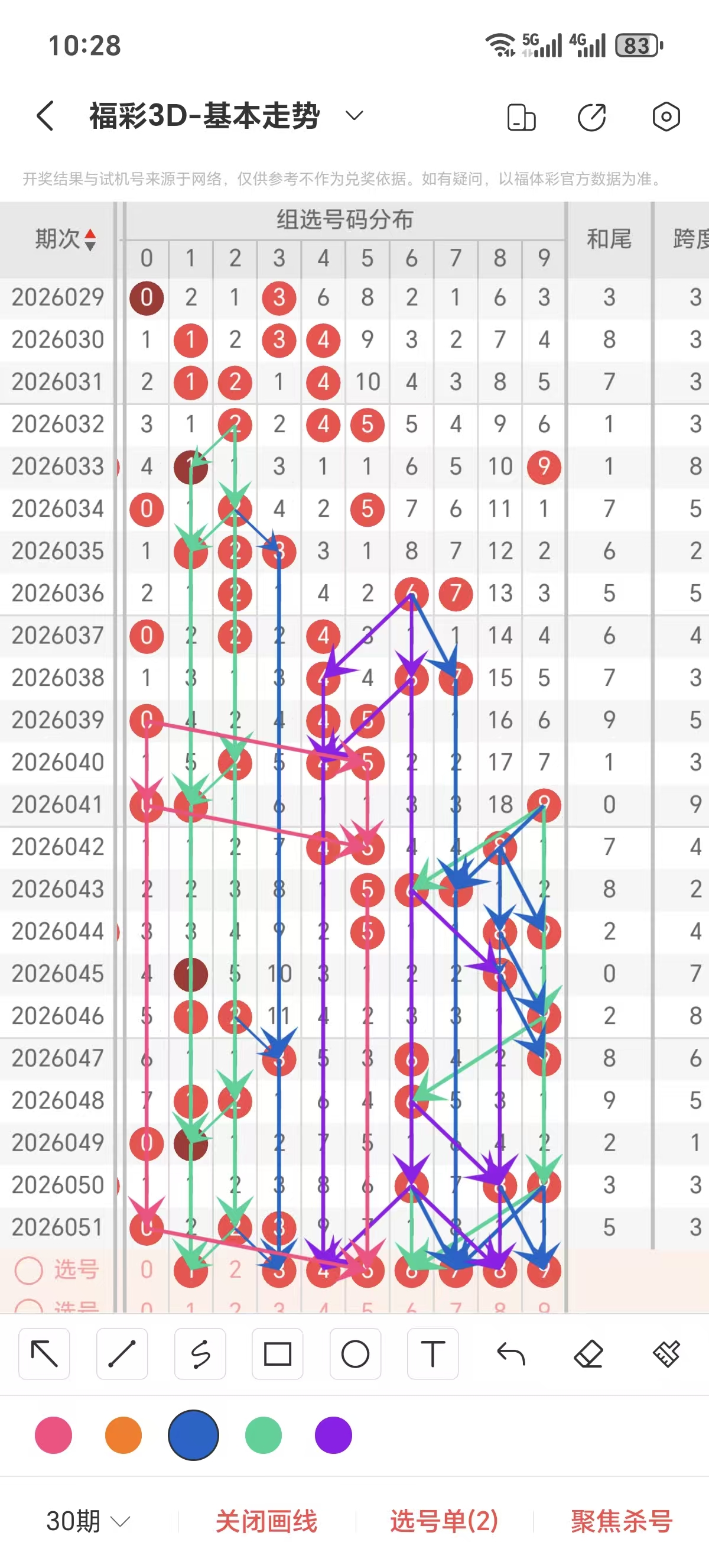 跨度通常情况下在五期之内重复一个跨度的概率很高,近五期重复了3的跨度,近五期跨度为6/5/1/3/3,近期0路的跨度较热,上期是0路的跨度,本期要侧重跨度以4/5/6跨为主的号码组合。可以从跨度方面选择相应的双胆码组合,双胆码的选取要根据近期和历史的走势进一步的分析选取。