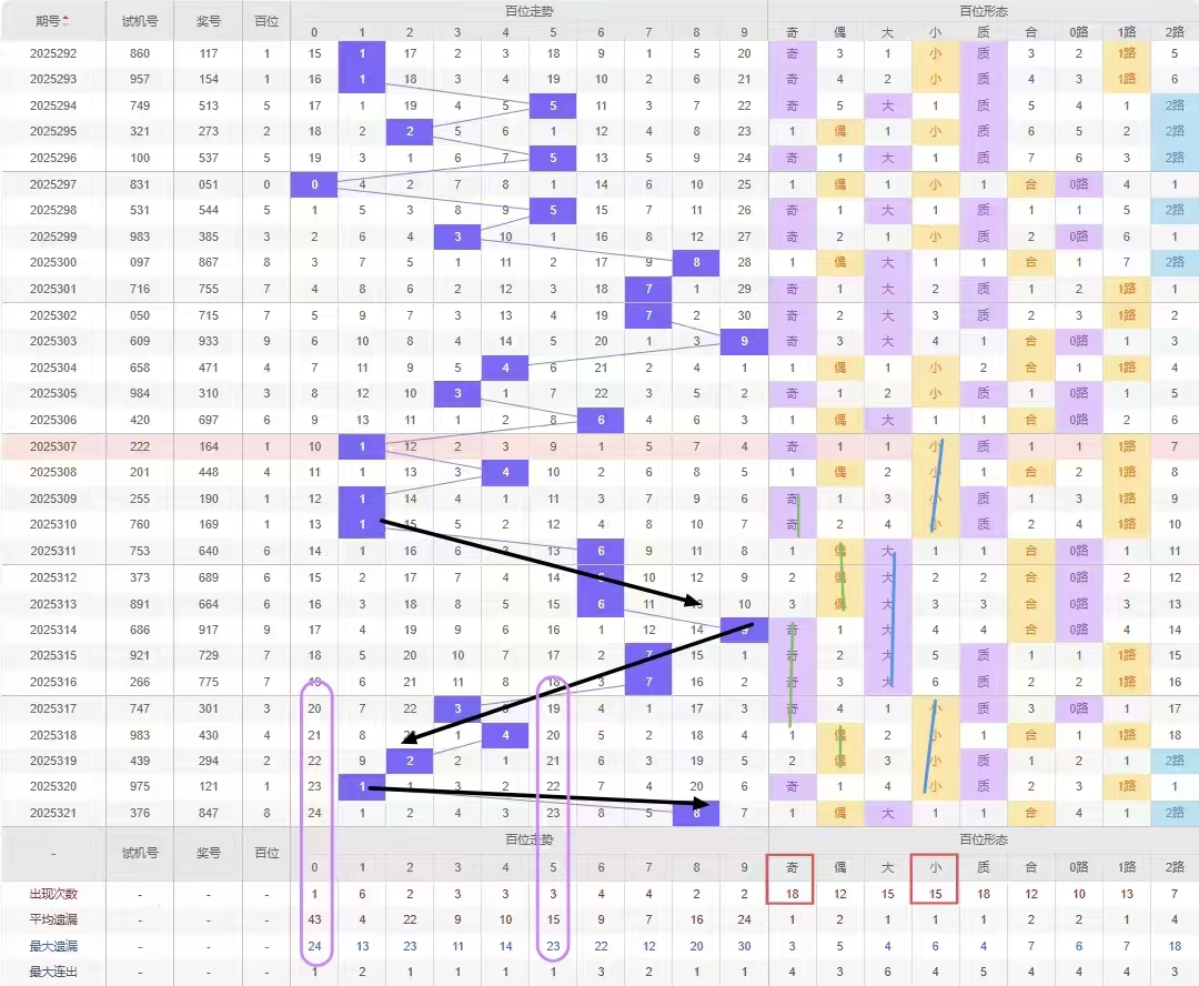 同理分析本期百位奇偶数形态,可以看到近15期开出奇数号8期偶数号7期,开出奇数号的概率与开出偶数号的概率几乎相同,上期开出偶数号那么本期继续开出偶数的概率上升建议选择遗漏期数较大的偶数号。杀号建议定在所有奇数号,但奇数号5号都已经遗漏了10期以上建议开出防冷号开出。