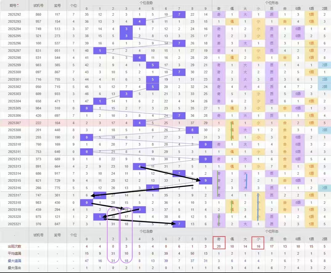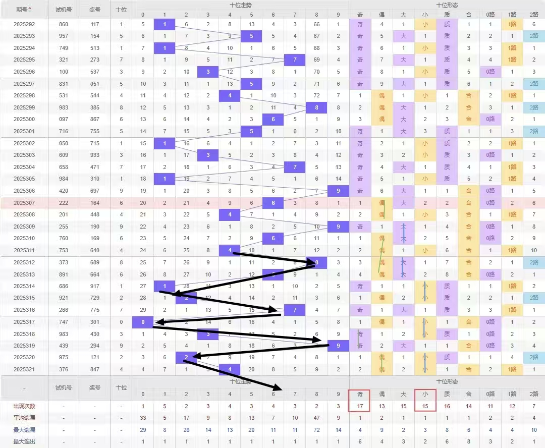 福彩3D第2025322个位先分析奇数偶数,近15期开出奇数号8期开出偶数号7期,开出奇数号的概率与开出偶数号的概率几乎相同,上两期开出奇数号那么本期开出偶数号的概率较大建议选择遗漏期数较多的偶数号开出。杀号定在所有奇数号,但奇数号3号都已经遗漏了10期以上建议开出防冷号开出。