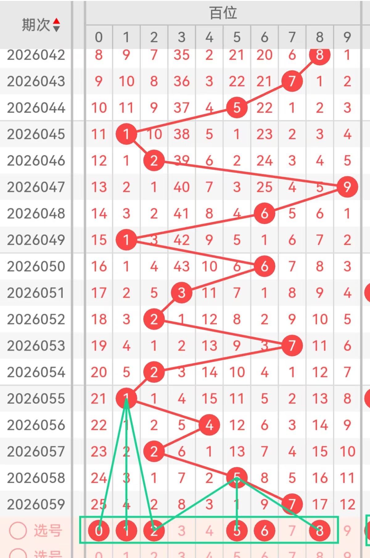 上期个位开出4,本期重点号码8、6、9,备用5、2。8作为2路合数大号,是个位近30期出现频次最高的热号,2路号码近期强势,8号可承接这一趋势,同时以大号偶数属性回补上期小号偏多的结构;6是0路偶数中号,近期个位0路号码整体偏少,6号温号属性稳定,能与8号形成偶数组合,防范奇数过度集中;9为0路大号奇数,近期个位大号略有降温,9号作为大号代表可补充奇数结构;备用号5为2路质数,可强化2路热度,2为2路最小号,能补位小号区间。
