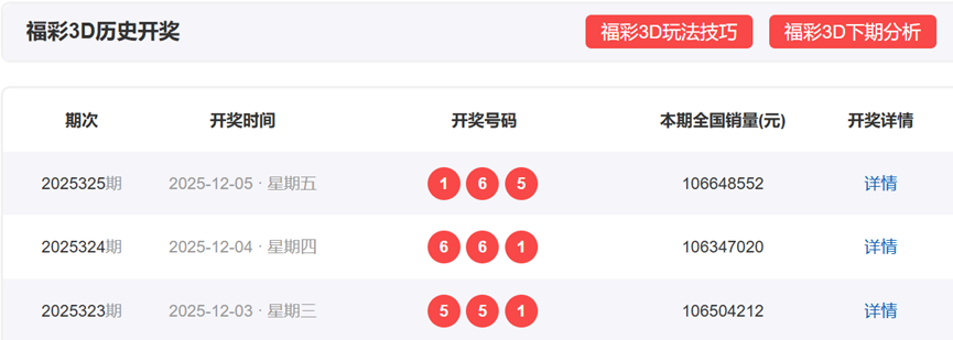 福彩3D上一期,开奖号码165,形态为组六,奇偶比为2:1,012路数值表现为102,和值12,和尾2,跨度5。