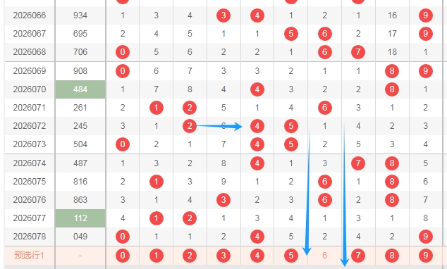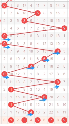 上图是福彩3D开奖号码从左到右定位第二位数字,我标注出来的蓝色箭头表示偶数数字,很明显最近开出的偶数数字多,那么本期第二位数字可以关注出奇数数字13579,个人最看好数字3579。