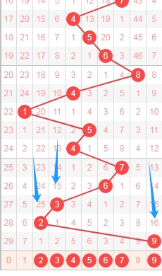上图是福彩3D开奖号码从左到右定位第三位数字,我标注出来的蓝色箭头表示遗漏周期,上期开出数字9遗漏周期是16期,上上期开出数字2遗漏周期是25期,那么根据这些遗漏周期分析,本期第三位数字可以关注出遗漏周期小的数字2345679,个人最看好数字3569。