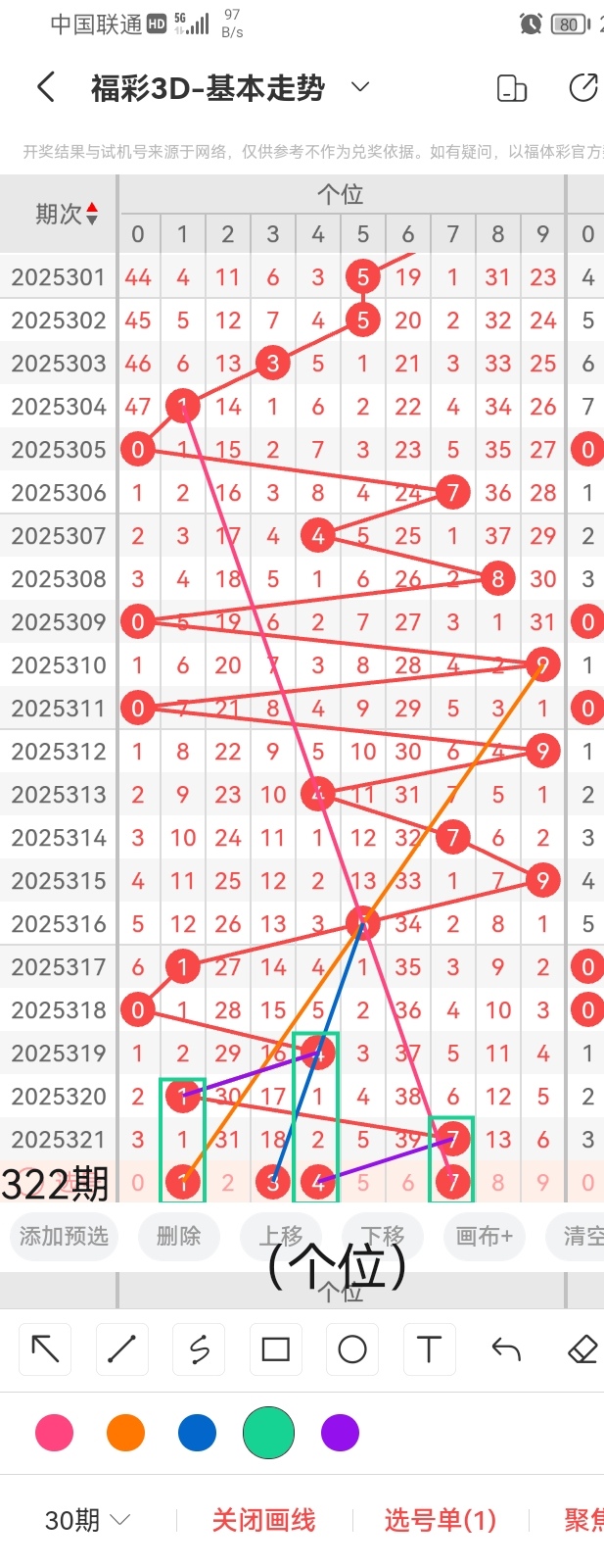 首先,小梁为了感谢各位老板的关注和打赏,特提供一个杀个位的小技巧,同尾杀号法,准确率相当高,但并不代表不出。根据同尾杀号法,得知本期杀个位2。其次,我们根据图中画线的思路可以看出,号码1与前几期开出的号码呈隔期回补的走势且呈斜三连的走位,跨度为6;遗落18期未出的号码3与前几期开出的号码呈斜三连的走势,跨度为4;号码4与前几期开出的号码呈隔两 期回补的走势且呈斜连前后相互平行的走位,跨度为3;号码7与前几期开出号码呈直连回补的走位且呈斜四连的走势,跨度为0。综上所述,小梁依据图中画线思路推荐个位的号码:1、3、4、7。