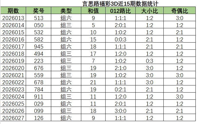 上期出的是组六,和值是9,跨度5,012路比1:1:1,奇偶比1:2,大小比1:2。