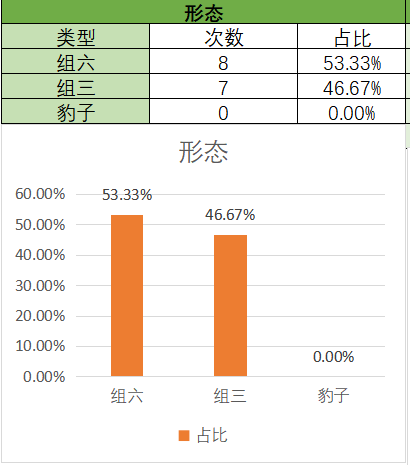 上期开的是组六,各个类型占比没有变化。通过图示可以看到,组六在15期内开了8期,组三开了7期。本期关注组六,防组三。