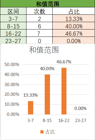 上期和值是9,处在8~15之间,其中8~15占比变大,3~7占比变小。目前是16~22占比最优,其次是8~15,最后是3~7。本期看好和值在8~15之间,其次是16~22。
