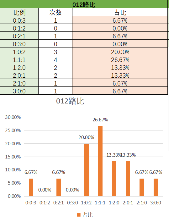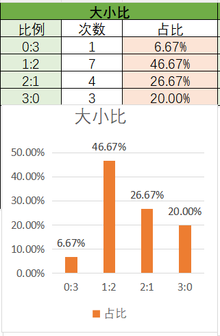 上期大小比为1:2,1:2占比变大,0:3占比变小。可以看到近15期内1:2优势最好的,其次是2:1,然后是3:0,最后是0:3。本期看好2:1开出,其次是1:2。