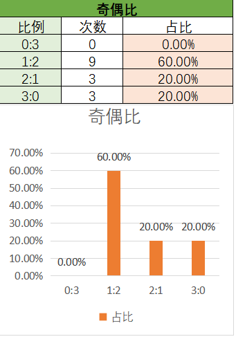 上期奇偶比为1:2,各个类型占比没有变化。近15期内1:2优势最大,然后是3:0,2:1。上期开了1:2奇偶比,本期看好2:1奇偶比的开出,其次是1:2。