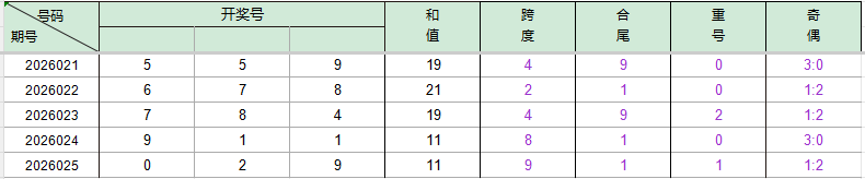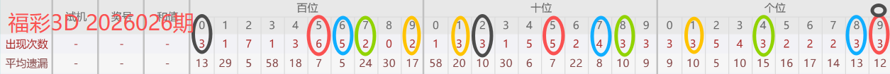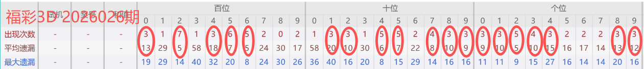 2026025期开奖号码029,我们可以看出近30期百位0出现3次,十位2出现3次,个位9出现3次。