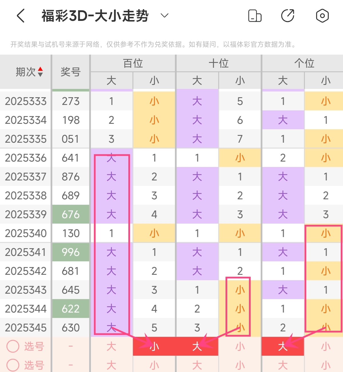 首先让我们回顾一下上期福彩3D第2025345期开奖号码为630,为组六形态,大小比为1:2,奇偶比为1:2,跨度为6,和值为9。