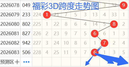 2)我们来看跨度;还是以79期——83期为例,如图依次是18676跨度,按照路数转换关系来看,那么跨度我们暂定56789跨 ,本期个人比较看好 5 8 9跨。