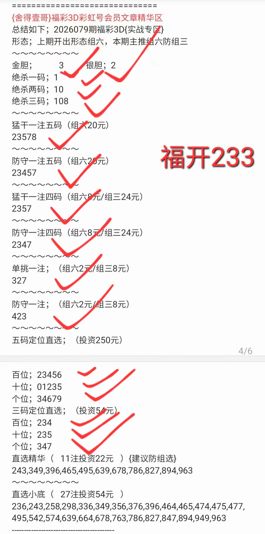 2026079期开出号码233,中三码定位直选/中五码定位直选/中金银双胆/中三码复式/中四码复式/中五码复式/中六码复式/中七码复式各两注。