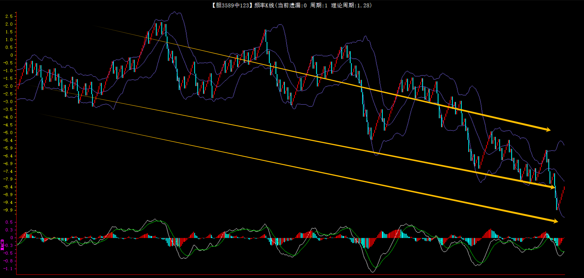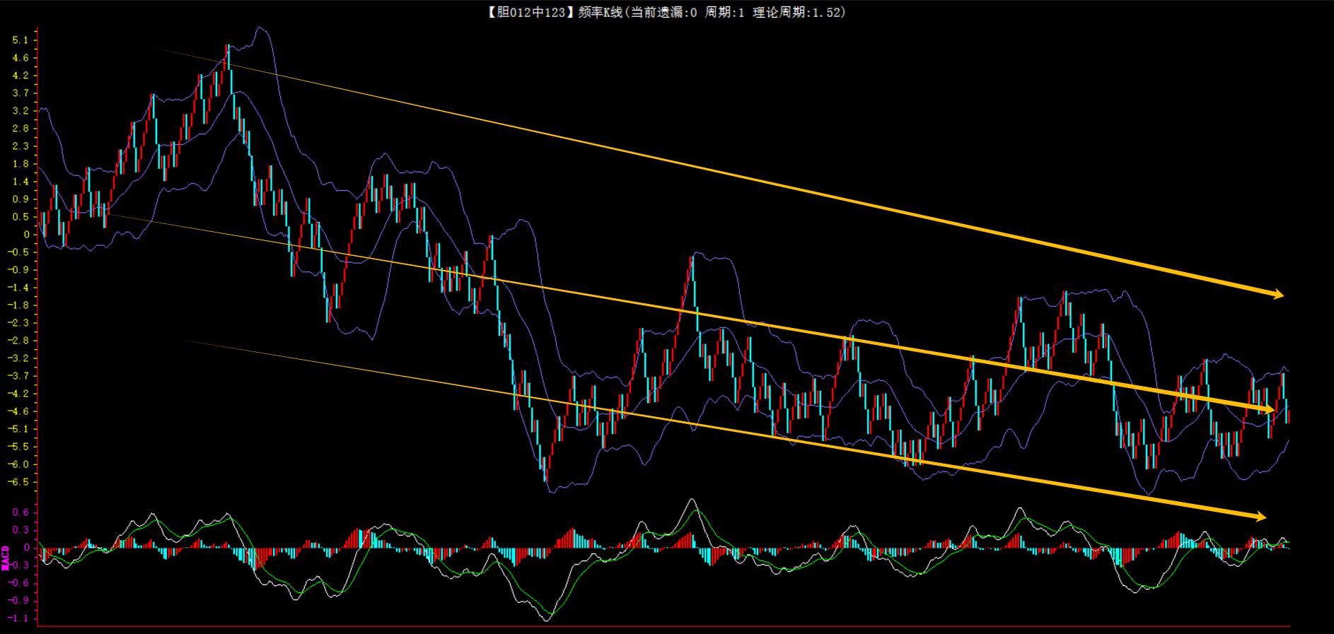 整体趋势下行,上边沿线趋势向下,下边沿趋势也是向下,节点震荡,当前开1期,本期防守。
