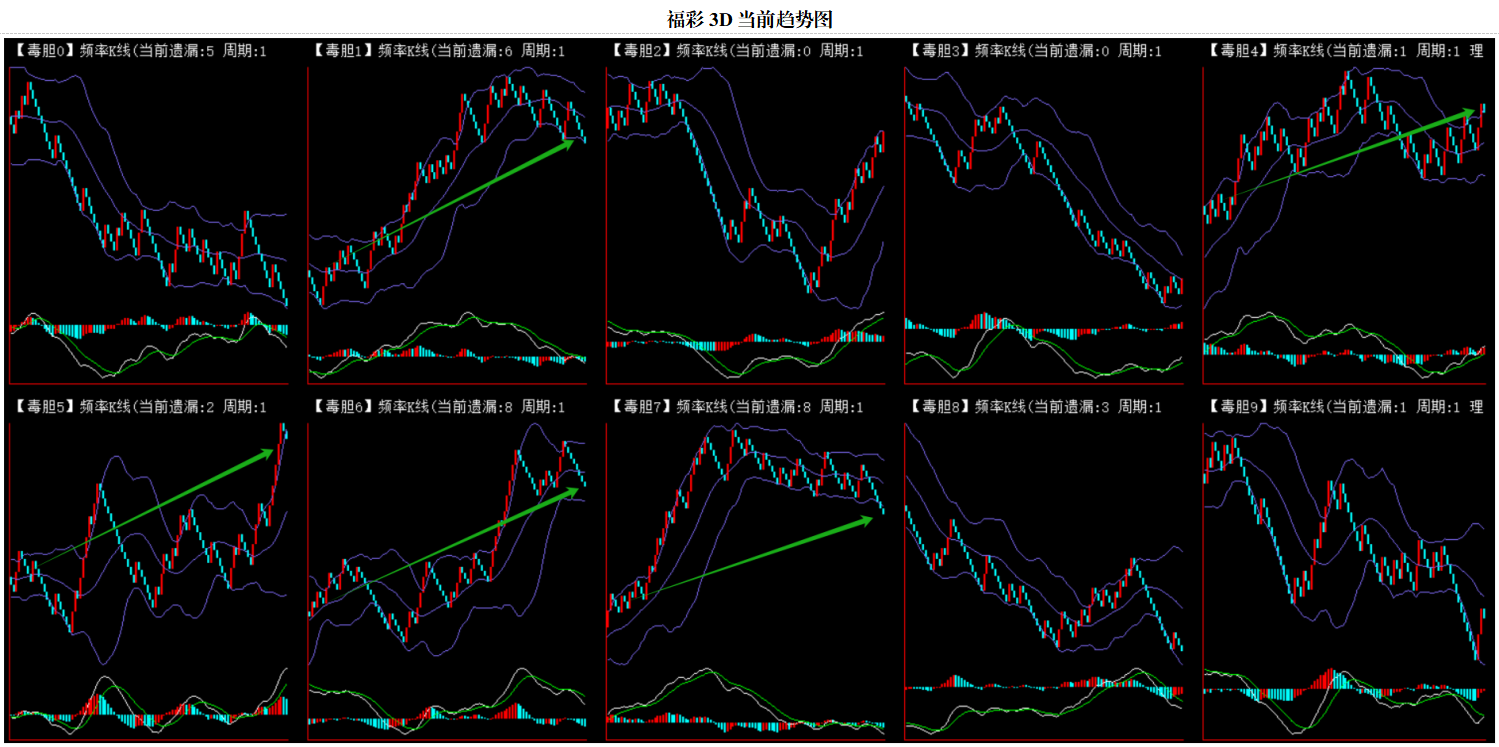 整体趋势上行,上边沿线趋势向上,下边沿趋势也是向上,节点震荡,当前遗漏1期,本期关注。