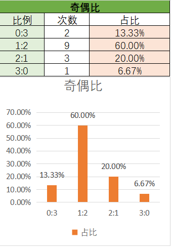 上期奇偶比为1:2,各个类型占比没有变化。近15期内1:2优势最好,其次是2:1,然后是0:3,最后是3:0。上期开了1:2奇偶比,本期看好1:2奇偶比的开出,其次是2:1。