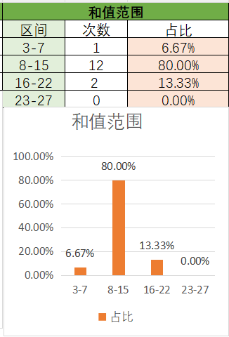上期和值是15,处于8~15之间,各个类型占比没有变化。目前是8~15占比最优,其次是16~22,最后是3~7。本期看好和值在8~15之间,其次是16~22。