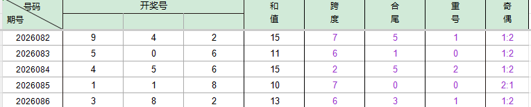 2026086期开奖号码382,我们可以看出近30期百位3出现1次,十位8出现3次,个位2出现4次。