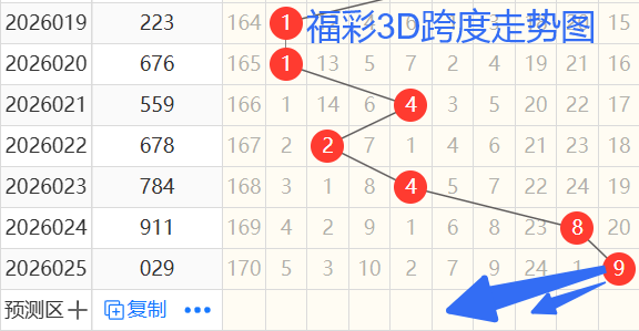 2)我们来看跨度;还是以021期——025期为例,如图依次是42489跨度,按照路数转换关系来看,那么跨度我们暂定0369258跨 ,本期个人比较看好5 7 0跨。