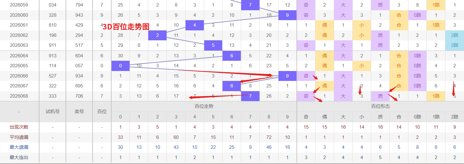 福彩3D百位分析:第2026068期百位开出号码7属于大奇数,从上面百位走势图上可以看出近100期大小比约为45:55奇偶比约为53:47。近期数据还是比较极端的符合文章开头介绍的求均衡规律非等量现象。但这种均衡不会持续最终会被偏态运行打破,然后循环往复。但短期内大小相差1点,小数过热大数有回补需求本期个人认为走大数的概率更高。上期百位落号“7”号球,在百位号码开出1路号码7后向大数方向走出1个振幅。那么通过分析上期百位落位号码分析,号码走出1个振幅,号码走为大奇数,开出1路号码7。通过对百位落号趋势来分析,百位号码落位后端,通过对近10期的走势来看百位号码大小交替频繁走2期大数又走3小数,近期3D百位走势来看,数字2作为热号表现极为活跃,其出号频率明显高于其他数字,且落位节奏紧凑,根据热号往往具备延续性的规律,短期内仍需防范其依靠惯性继续坐庄或隔期再返;与此同时,数字8目前处于深度冷态,遗漏周期已远超理论值,进入冷号回补的警戒区间,从冷热转换的逻辑分析,冷号在积累足够遗漏后随时可能迎来反弹,尤其是在热号2出现间歇时,更要警惕8的突然解冻。我们在百位关注的重点在02458这5个号码球上,百位号码近期奇偶切换频繁,7号球码属于1路号码奇数,现奇数开出过多有向偶数的趋势。所以福彩3D第2026069期百位看02458。