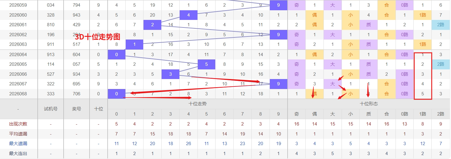 福彩3D十位分析:第2026068期十位开出号码0属小偶数号码前端。以历史100期数据为例十位奇偶比约为55比45,大小比约为51比49近期大小相差9点,根据求均衡的规律开出小数的概率比大数高一点。上期我们分析奇数经过连续回补后有走偶数的可能,开出奖号0小偶数符合我们的预期,近期3D十位走势来看,数字1作为热号表现十分活跃,其出号频率显著高于其他数字,且落位节奏紧凑,根据热号往往具备惯性延续的规律,短期内仍需防范其继续坐庄或隔期再返;与此同时,数字6目前处于深度冷态,遗漏周期已远超理论值,进入冷号回补的警戒区间,从冷热转换的逻辑分析,冷号在积累足够遗漏后随时可能迎来反弹,尤其是在热号1出现间歇时,更要警惕6的突然解冻。所以福彩3D第2026069期十位推荐14567。