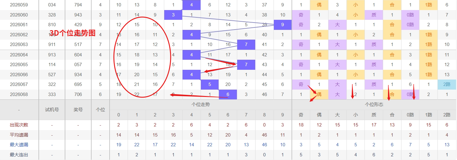 福彩3D个位分析:第2026068期个位开出号码6属于大偶数中端,从以上个位走势图中可以看出近100期的大小比约为49:51奇偶比约为52:48大小奇偶数据上有点差异有需求但不是太明显,不太好看这时就要借助连线走势和遗漏数据来帮助我们缩水号码。上期个位落号“6”大偶数0路号码球,号码开出了1振幅,连续多期的大振必被小振幅取代幅符合我们的预期,那么本期我们在个位考虑振幅走势走前依然要转变思路考虑大振幅,具体考虑(2-6)个振幅是我们主要的方向,那么在对个位落号情况进行系统的分析时我们可以明显的看到个位号码走势呈现大范围震荡,尤其是在号码的落位特点上表现的尤为突出,那么本期我们在个位分析时就要注意号码的风险,避免出现踏空。近期3D个位走势来看,数字2作为热号表现活跃,其出号频率明显高于其他数字,且落位节奏紧凑,根据热号往往具备惯性延续的规律,短期内仍需防范其继续坐庄或隔期再返;与此同时,数字8目前处于深度冷态,遗漏周期已远超理论值,进入冷号回补的警戒区间,从冷热转换的逻辑分析,冷号在积累足够遗漏后随时可能迎来反弹,尤其是在热号2出现间歇时,更要警惕8的突然解冻。因此福彩3D第2026069期个位看好12389。