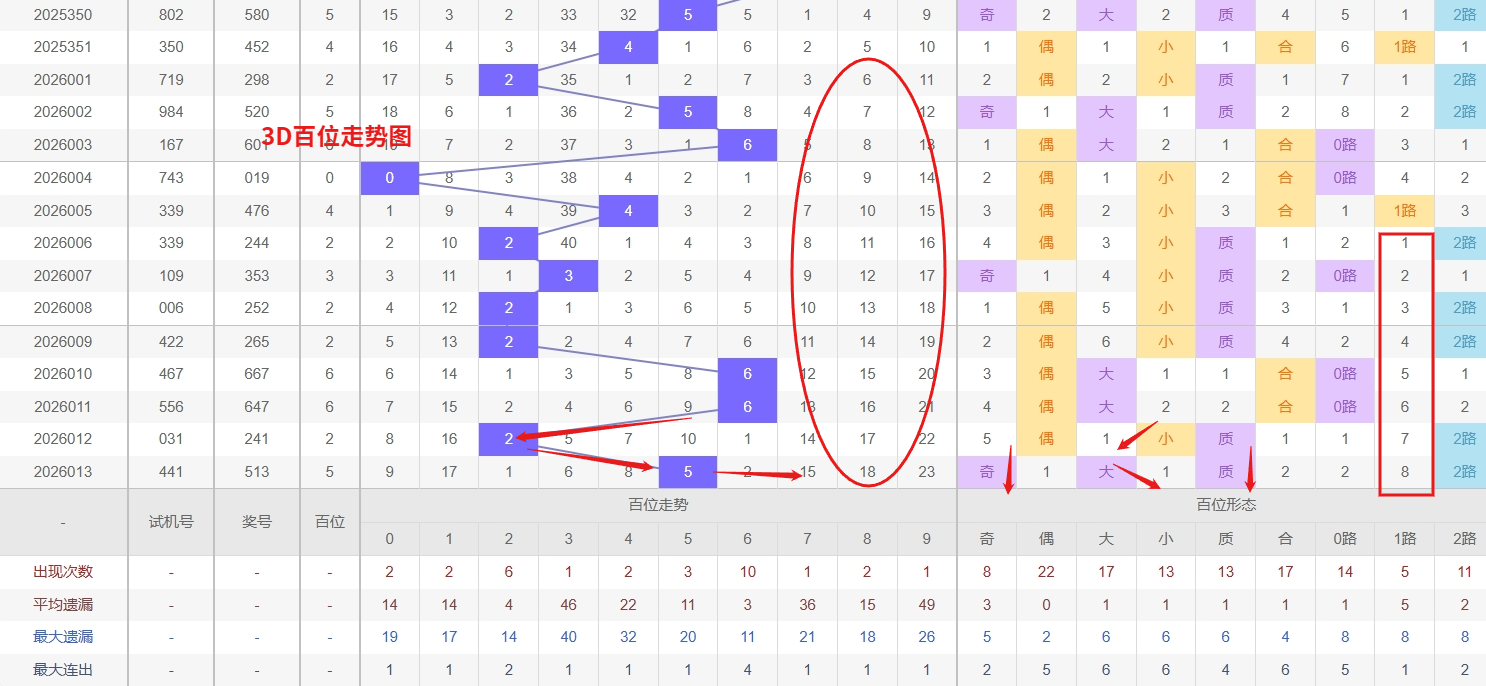 福彩3D百位分析:第2026013期百位开出号码5属于大奇数,从上面百位走势图上可以看出近100期大小比约为54:46奇偶比约为55:45。近期数据还是比较极端的符合文章开头介绍的求均衡规律非等量现象。但这种均衡不会持续最终会被偏态运行打破,然后循环往复。但短期内大小相差3点,小数过热大数有回补需求本期个人认为走大数的概率更高。上期百位落号“5”号球,在百位号码开出2路号码5后向大数方向走出3个振幅。那么通过分析上期百位落位号码分析,号码走出3个振幅,号码走为大奇数,开出2路号码5。通过对百位落号趋势来分析,百位号码落位中端,通过对近10期的走势来看百位号码大小交替频繁走3期大数又走2小数,近期3D百位走势综合分析,号码3与7已进入明显的冷态区间,其遗漏期数均已达到较高数值。从统计学与概率分布的角度看,任何一个位置上的号码长期遗漏后,其理论回补的需求会不断累积,短期内出现反弹开出的可能性显著增加,因此这两枚冷号值得重点跟踪关注。与此同时,号码2则呈现出截然相反的热态趋势,在近期的开奖中表现活跃,出现频率较高。在积极布局冷号3、7以期捕捉其回补机会的同时,务必对热号2的持续走热保留足够的防守筹码,我们在百位关注的重点在23789这5个号码球上,百位号码近期奇偶切换频繁,5号球码属于2路号码奇数,现奇数开出过多有继续向奇数的趋势。所以福彩3D第2026014期百位看23789