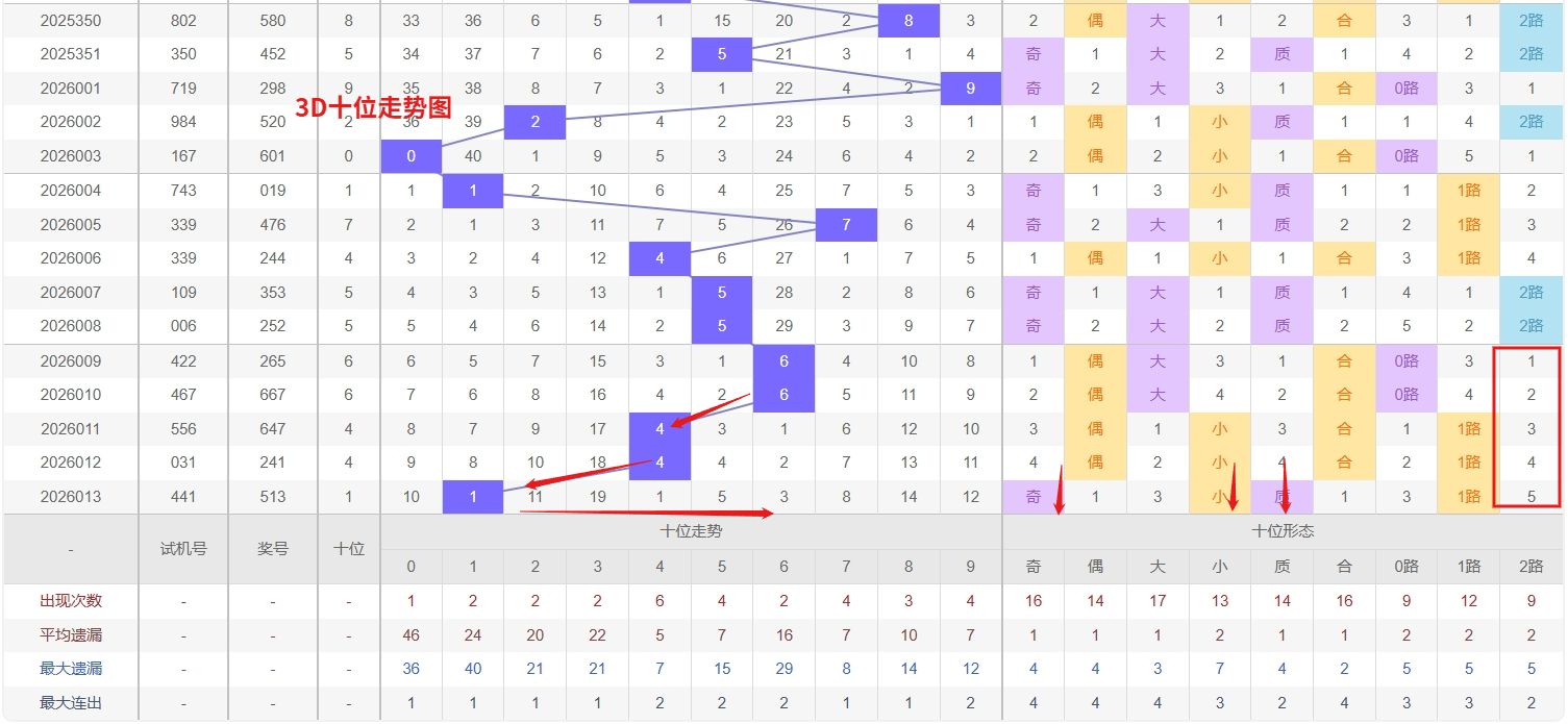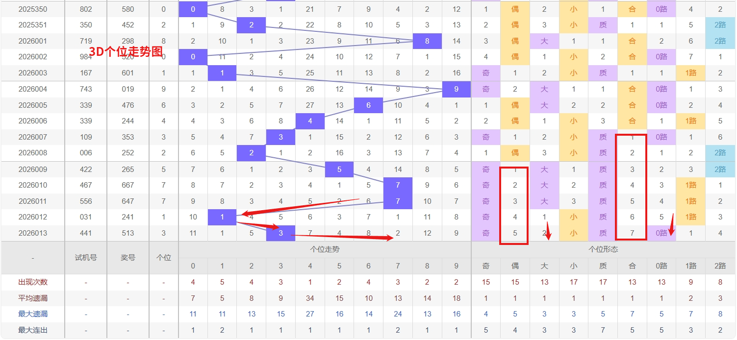 福彩3D个位分析:第2026013期个位开出号码3于小奇数前端,从以上个位走势图中可以看出近100期的大小比约为48:52奇偶比约为55:45大小奇偶数据上有点差异有需求但不是太明显,不太好看这时就要借助连线走势和遗漏数据来帮助我们缩水号码。上期个位落号“3”小奇数0路号码球,号码开出了2振幅,连续多期的大振必被小振幅取代幅符合我们的预期,那么本期我们在个位考虑振幅走势走前依然要转变思路考虑大振幅,具体考虑(1-5)个振幅是我们主要的方向,那么在对个位落号情况进行系统的分析时我们可以明显的看到个位号码走势呈现大范围震荡,尤其是在号码的落位特点上表现的尤为突出,那么本期我们在个位分析时就要注意号码的风险,避免出现踏空。近期3D个位走势综合分析,号码0和1表现极为活跃,已形成稳定的热态格局,根据热者恒热的走势规律,短期内这两枚号码仍有很大概率会继续连下或交替开出,是当前需要重点关注和追踪的对象。与此同时,号码4则处于明显的冷态区间,遗漏期数不断累积,从冷热平衡的角度看,任何冷号都存在理论上的回补需求,尤其在大热号码持续释放之后,冷号反弹的风险与可能性也在同步增加,因此对冷号4的出现加以防范。因此福彩3D第2026014期个位看好01468。