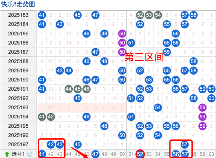 三区间开出了4个奖号(42.43.45.57.)上期回顾三区开出4个奖号上期的三区间的奖号数量呈现一个递增的形态,4头回补3,本期先来看号码41近期出现频率相对来说是很稳定。偶尔有时间隔期数也是很长,说明其在近期的开奖中较稳定,号码51在近 30 期内出现次数相对较稳定的号码,近期的活跃度也是较稳定。号码47有一定的间歇性,通常间隔7-3期会出现一次,有明显的连续出现态势,走势相对较稳定,在整个第三区间的表现本期还是可以防守的。号码52走势相对近期是很稳定,近期有连续间隔落号的情况,活跃度近期处于稳定状态注意防守。
