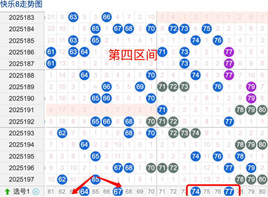 上期四区间开出了5奖号(62.65.78.79.80上期的四区开5个奖号呈现了一个递减的趋势,开出的奖号7头回补2个,6头开回补了2,先来看号码64在近 30 期内属于一个温热的号码,近期出现频率相对来说是很稳定,偶尔会间隔多期后出现一次,这个号码要注意防守,号码74具有一定的间歇性活跃度较热比如有时会间隔期就再次出现,近期整体出现频率比较热,近期还是要关注的.号码77活跃度近期比较稳定,有一定的间歇性。活跃度近期还算稳定,整体走势有一定的波动性.