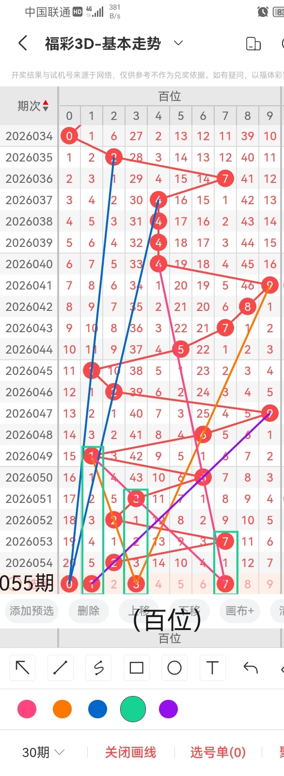 首先,小梁在这里给大家分享一个粉丝福利,给粉丝提供每期福彩3D杀一百位的号码:8;准确率高达95.36%。其次,小梁结合上图中画线的思路走势分析得出,遗落20期未出的号码0与前几期开出的号码呈两条斜三连的走势,跨度2;号码1与前几期开出的号码呈斜四连的走势且呈隔五期回补的走位,跨度是1;号码3与前几期开出的号码呈左右两条斜三连的走位且呈隔三期回补的走势,跨度1。然后,小梁结合上图中的画线思路走位分析,号码7与前几期开出的号码呈两条斜三连的走势且呈隔期回补的走位,跨度为5。综上所述,小梁本期推荐百位的号码为:0、1、3、7。