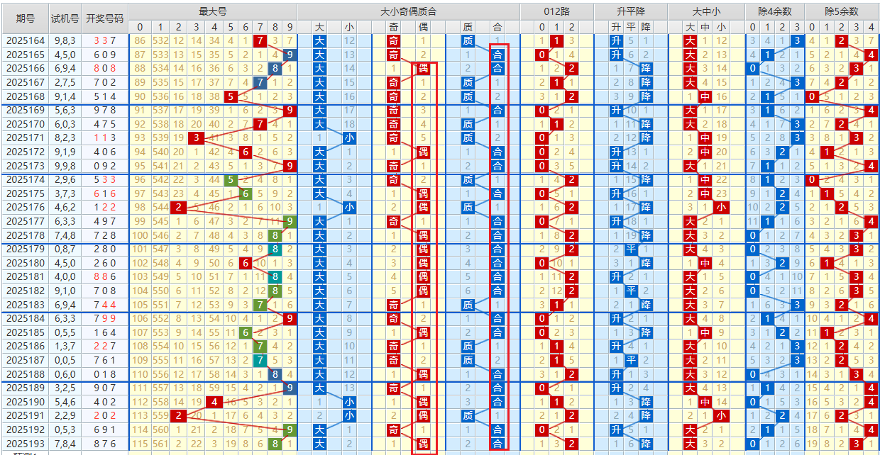 核心号:4、5、6:十位冷码5(遗漏50期)为中间号潜力股;个位3、5为热态(近10期6次)。历史同期中间号奇偶均衡,偶数略优