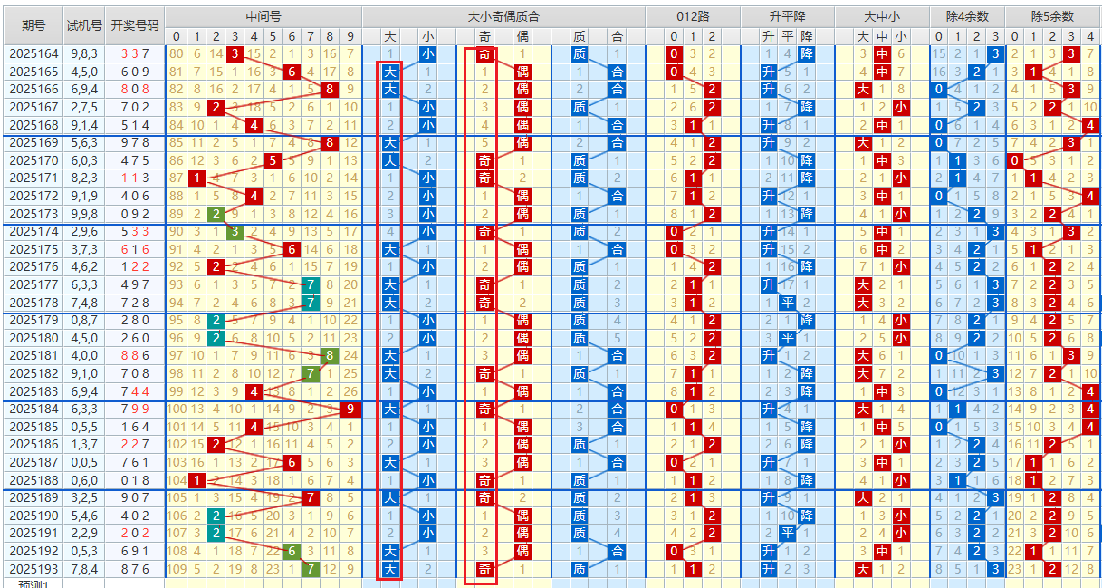 两大一小(概率最高):上期全大组合(876)后,历史规律显示全大后两小一大概率达40%,两大一小概率36%