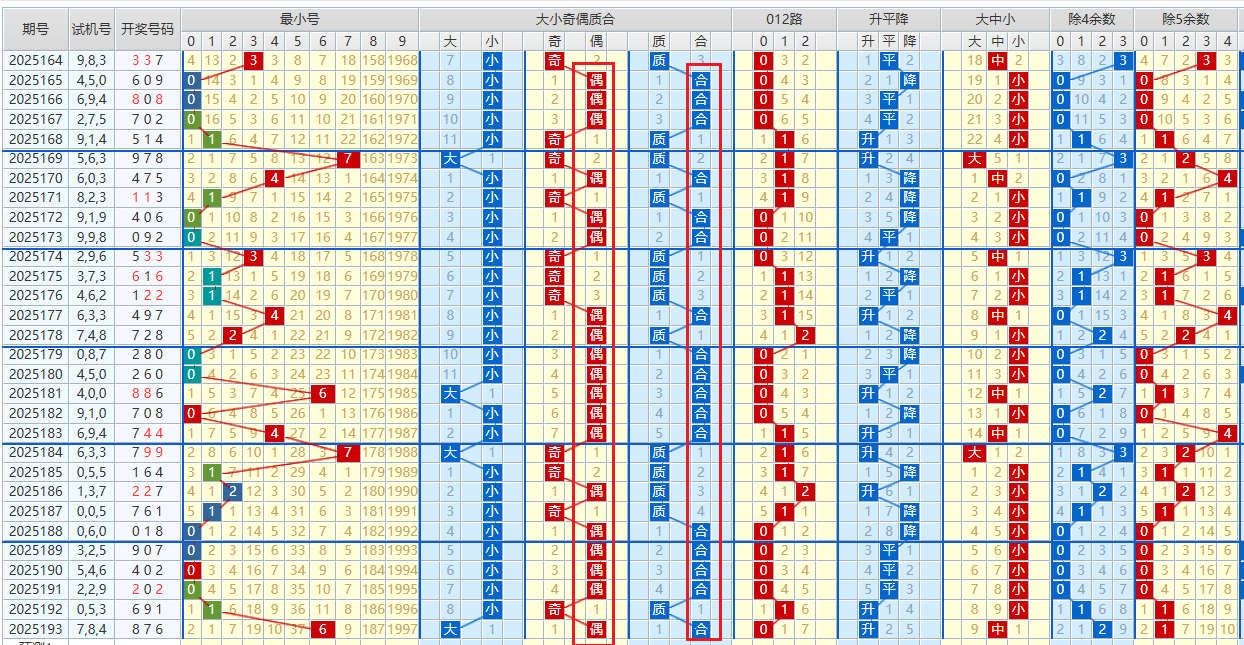 1奇2偶:历史同期奇偶比29:40,偶数占优;近50期两偶一奇占比36%,当前遗漏0期