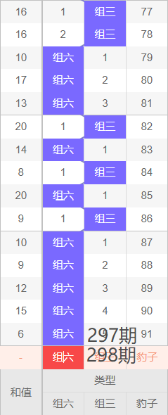 上期形态:组六,近10期的形态分别为:组三,组六,组三,组六,组三,组六,组六,组六,组六,组六,近期组三和组六的形态比较规律性,根据以往形态规律,本期个人认为需要重点关注组六落位,同时也需要防组三形态的开出。