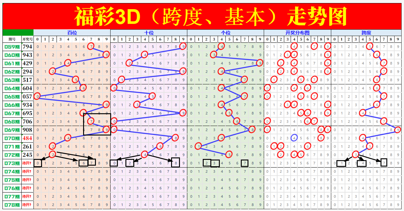 对于跨度,根据这几期的走势情况,重点关注1、4、7跨的可能。本期跨度应该不会太大,围绕3跨周边开始。