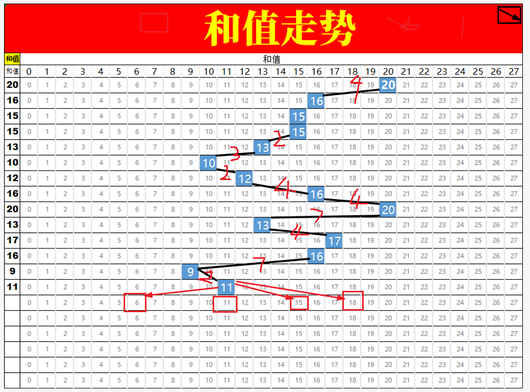 如上图我标记出来的,近十多期和值走势情况。两两间隔的数字之差基本是在0.2.3.4.7之间。所以,本期除了防守11和值重下,剩下的就是和值6,15,18参考。假如继续开出11和值,那我比较看好组三227。