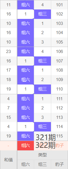 上期形态:组六,近10期的形态分别为:组六,组三,组六,组六,组三,组六,组六,组六,组三,组六,近期组三和组六的形态比较规律性,根据以往形态规律,本期个人认为需要重点关注组六落位,同时也需要防组三形态的开出。
